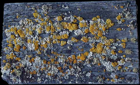 Buntes Blattflechten-Mosaik auf Holzschindel.